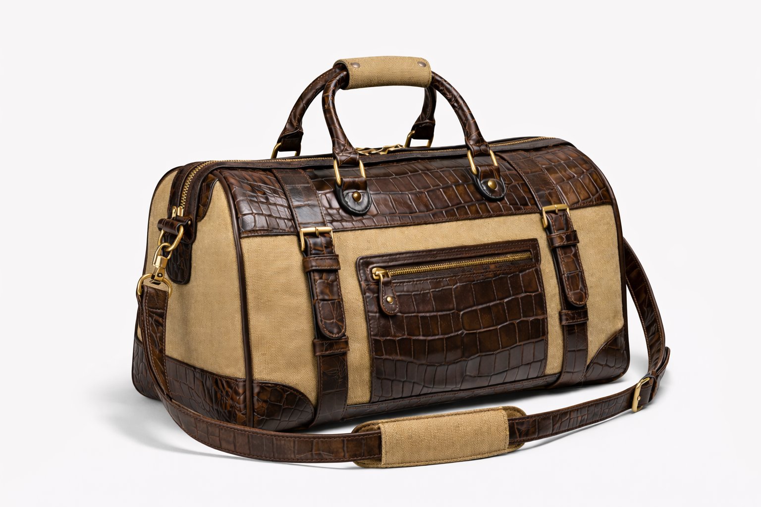 This duffle changes the way you’re perceived before you say a word. The authentic American alligator runs clean across the crown and front pocket, uninterrupted over the zipper line, balanced by structured duck canvas. The contrast is controlled. Refined. Nothing excessive.