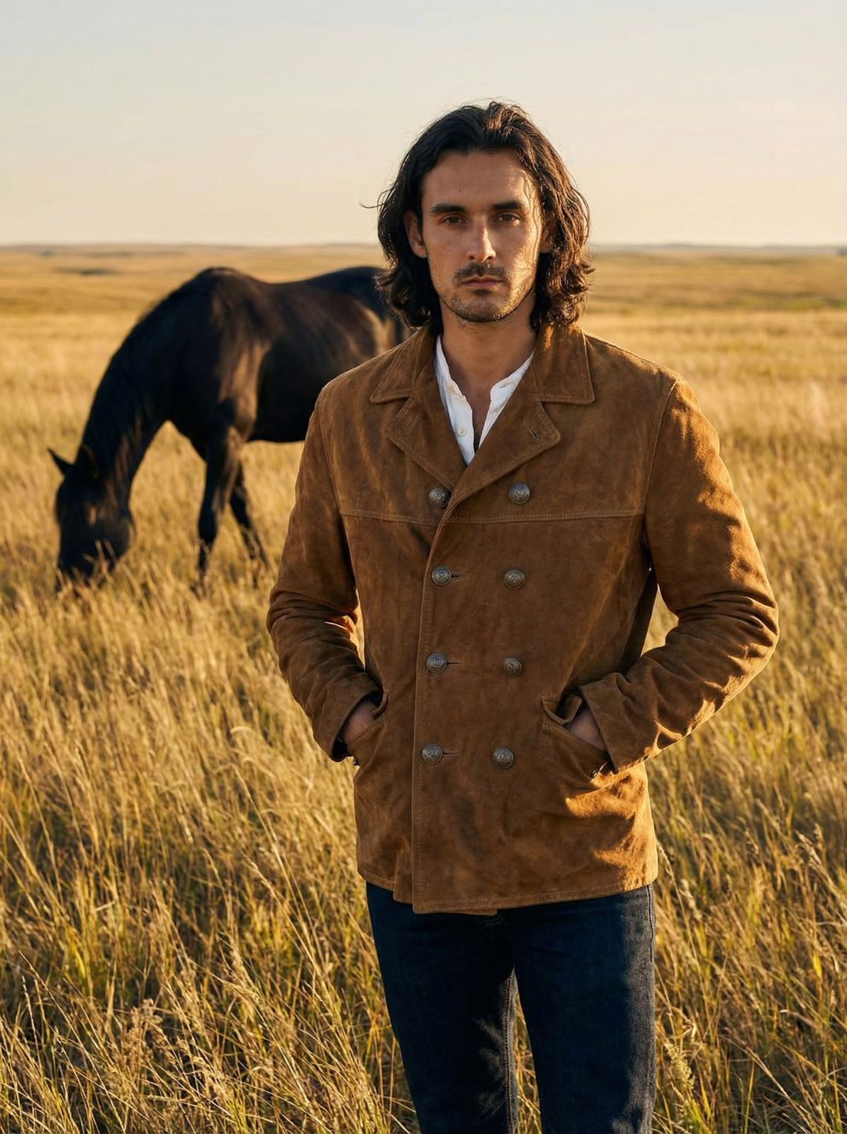 The jacket draws from mid-century American outerwear where tailored structure met rugged materials. The double-breasted front provides a more refined profile while the suede keeps the piece grounded in Western and workwear heritage.
