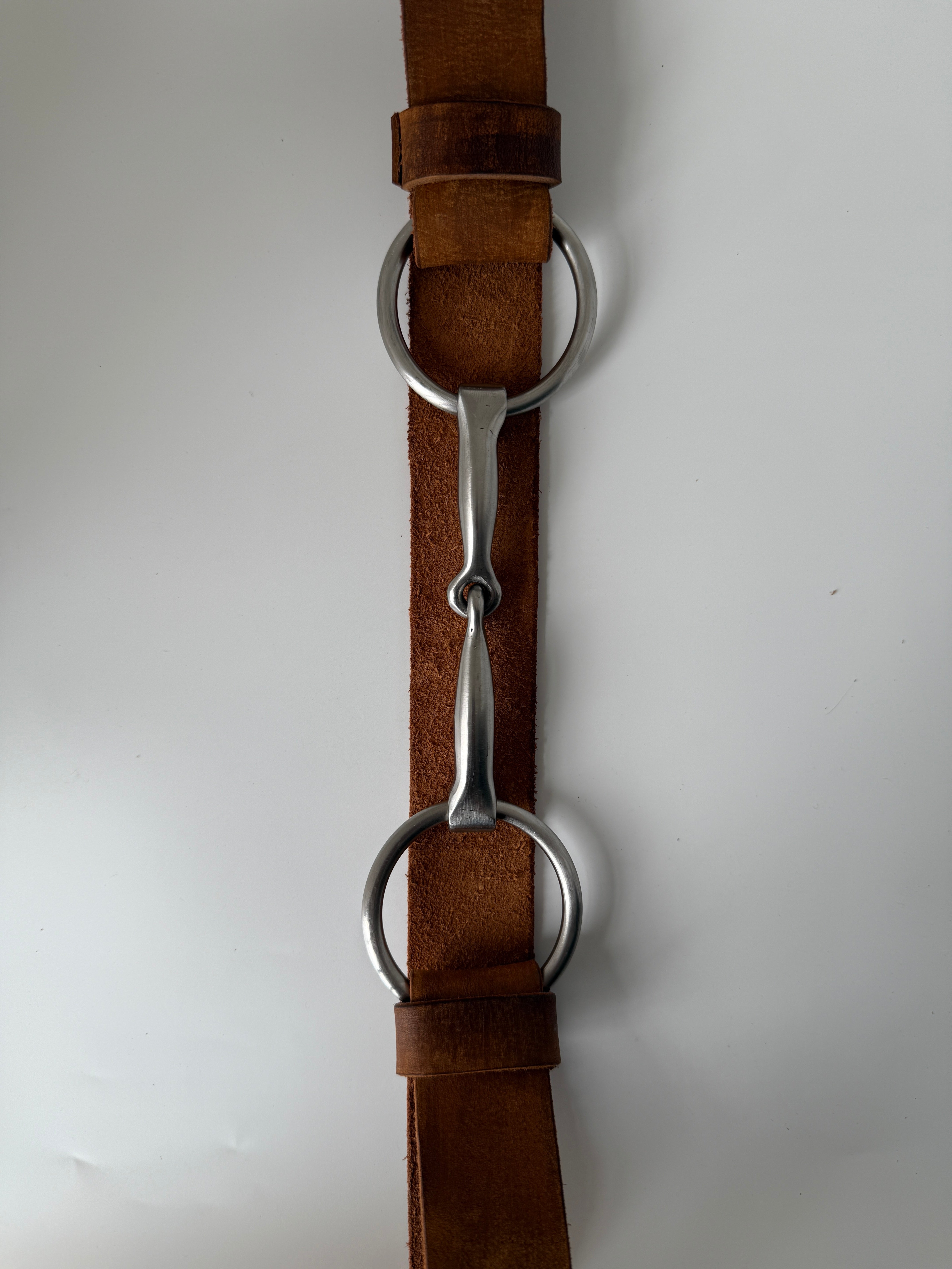 The centerpiece is a traditional pony horse bit — a shape long associated with riding, ranch work, and the relationship between rider and horse. Strong, simple, and instantly recognizable, the bit becomes the functional closure and defining character of the belt.